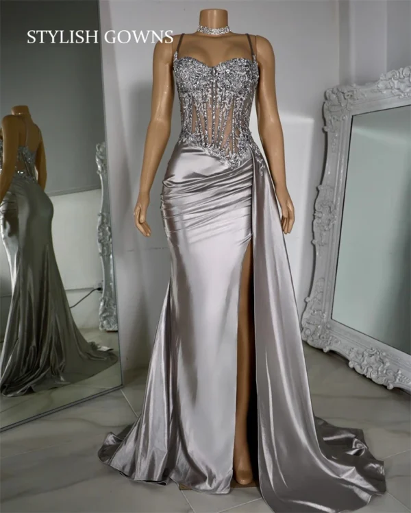 When selecting the perfect gown for your special occasion, silver prom dresses are always an elegant and timeless choice. This silver prom dresses blends classic style with modern sophistication, making it an excellent option for proms, cocktail parties, evening galas, or birthdays. With stunning pleats, a sweetheart neckline, high slit, and applique detailing, this dress promises to give you a chic and glamorous look, ensuring you stand out from the crowd.